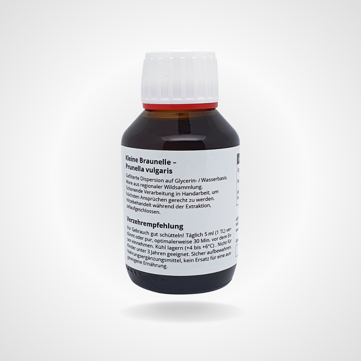 Kleine Braunelle-Dispersion wird in Handarbeit mit Material aus regionaler Wildsammlung hergestellt und verwendet als Trägermaterial nur Wasser und pflanzliches Glycerin. Durch das angewendete Dispergierverfahren bleiben im Gegensatz zu herkömmlichen Extraktionsmethoden die Ballaststoffe weitgehend im Produkt erhalten. Somit zeichnet sich dieses Produkt qualitativ und größtenteils auch quantitativ durch das volle Inhaltsstoffspektrum der Kleinen Braunelle aus. Sämtliche, essentielle Bestandteile der Pflanze sind im Trägermaterial aufgeschlossen und verfügbar gemacht.